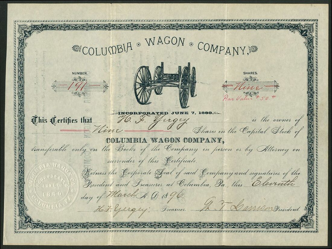 U.S.A: Columbia Wagon Company, $50 shares, Columbia, Pa 18[96], #191, signed by William T. Garrison as President and H. J. Yergey as Treasurer. Also issued to him. Vignette of the company's Eclipse steel wagon, black, NOT cancelled. Known as Columbian, makers of farm and dump wagons. Also one of the several wagon companies that supplied commercial bodies for Fords Model T chassis. Garrison died in 1921 followed within 6 months by Yergey and the company was sold to the Columbia Body Corporation. GVF and scarce.