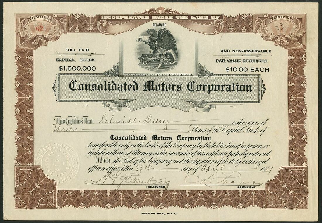 U.S.A: Consolidated Motors Corporation, Delaware, $10 shares, 19[17], #82, eagle at top, brown and black. Incorporated in 1917 by C. K. Thomas to take over several firms in the truck industry including Thomas Auto Truck Company and the Armored Motor Car Company. In bankruptcy by the end of the year. EF.