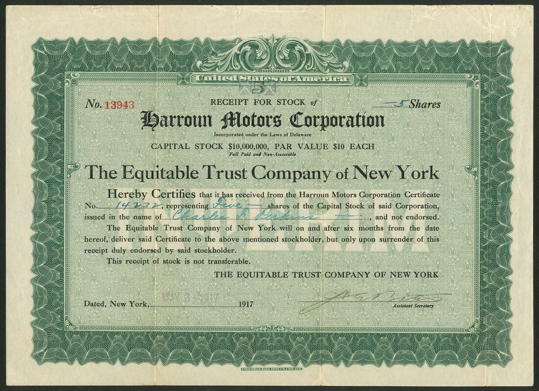 U.S.A: Harroun Motors Corporation, Delaware, $10 shares, 19[16], #4392, brown together with a receipt for stock issued by the Equitable Trust Company of New York, 1917, #13943, green. Ray Harroun, the winner of the first Indianapolis 500, developed his own car in Wayne, Michigan in 1917 producing more than 500 cars before the factory was turned over to munitions manufacture. Although motor production carried on from 1919 numbers were very small and company failed in 1922. VF (2).