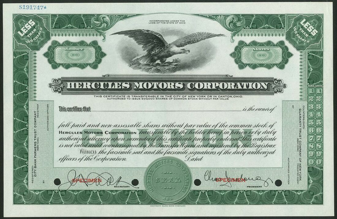 U.S.A: Hercules Motors Corporation, Ohio, a specimen certificate for less than 100 shares, common stock, undated but 1923 or later, eagle at top, green and black, printed by the Security Bank Note Company, overprinted SPECIMEN in red. Founded in 1915 as Hercules Motor Manufacturing Company to build engines for trucks and goods vehicles. Reorganised as this in 1923. Made a significant contribution to the war effort supplying 750,000 engines for military vehicles, ships and equipment. Bought out by the Hupp Corporation in 1961 which in turn was purchased by White Truck. Defunct in 1999. EF and rare.