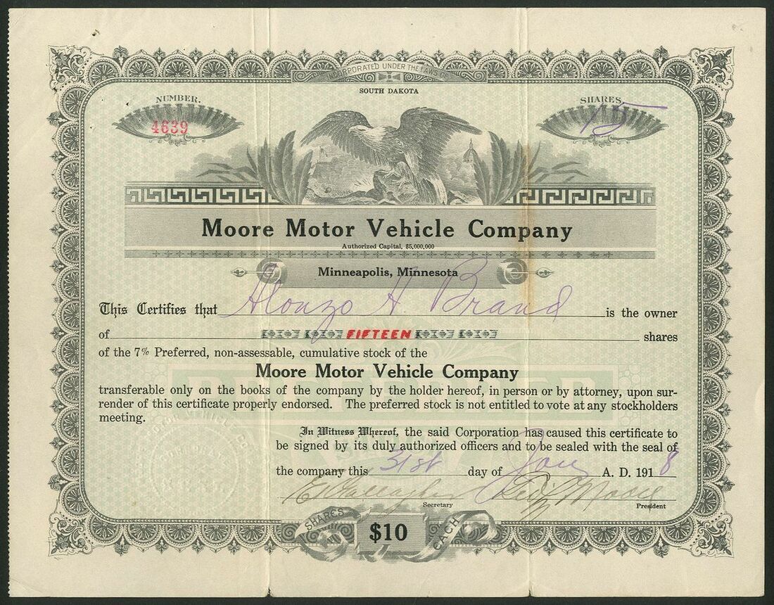 U.S.A: Moore Motor Vehicle Company, South Dakota, $10 shares, 191[8], #4639, eagle at top, black, green underprint. Signed by George Moore who was a Ford dealer in Minneapolis who formed this company to build a motor car to compete with the Model T. Moved to Danville Illinois in 1919 but was in receivership in 1920 with just over 1000 vehicles built. Later Moore was convicted for fraud in the sale of stock, a very popular pastime in the motor industry at the time. Minor splitting at folds, AVF