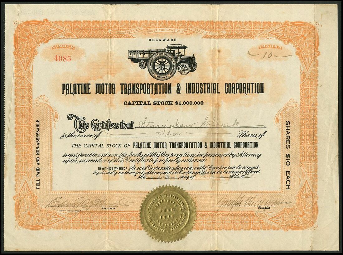 U.S.A: Palatine Motor Transportation & Industrial Corporation, Delaware, $10 shares, common stock, 19[21], #4085, vignette of motor truck, orange and black. Slightly different printing to the last. F-VF.