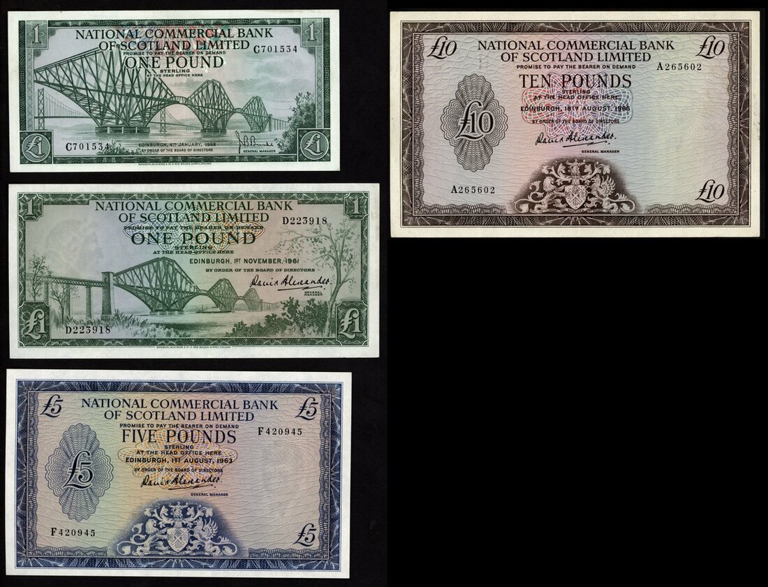 National Commercial Bank of Scotland Limited, £10, 18 August 1966, serial number A265602, also £5 1963 and £1 (2) 1961, 1968,