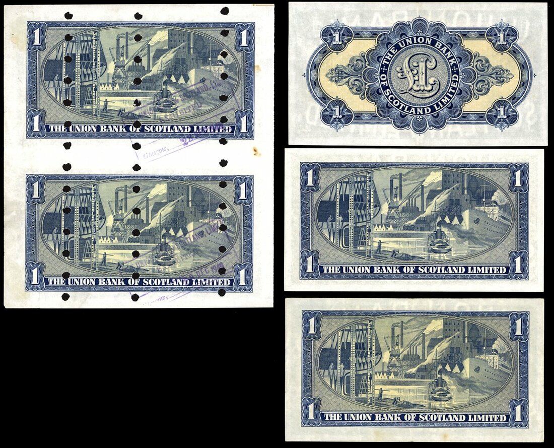 Union Bank of Scotland, a group of £1, 1934, 1952, 1954, also a uncut pair of £1 1949, (PMS UB63d, UB68a, b,), 1954 very fine, others pressed extremely fine, uncut pair cut from a sheet perforated (4 notes)