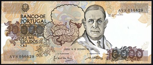 (x) Banco de Portugal, 10000 escudos, 14 December 1989, Ch.1, serial number AVN 040429, brown and multicoloured, Moniz at centre, arms top left