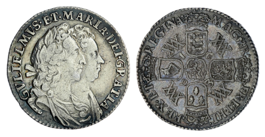 William and Mary (1688-1694), Sixpence, 1693, conjoined laureate and draped busts right, rev. crowned cruciform shields, monogram in angles, three strings to harp, obliquely milled edge, 3.00g, 6h (ESC 1529; Bull 869; Spink 3438), the obverse cleaned, yet some toning to legend, the reverse with an attractive cabinet tone, very fine