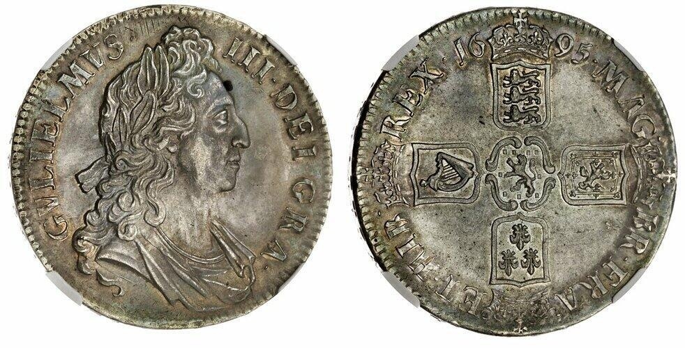 William III (1694-1702), Great Recoinage, Crown, 1695 SEPTIMO, London, first laureate, draped and cuirassed bust right, round breast plate, rev. crowned shields cruciform, six strings to harp, edge lettered downwards, cinquefoil stops, 29.92g, 6h (Bull 990; ESC 86; Pywell-Phillips - [cf. 168]; Spink 3470), faint adjustment to periphery and some possible smoothing before face, otherwise beautifully toned, good extremely fine and much as issued, the most wholesome example this cataloguer has seen of this frequently encountered issue