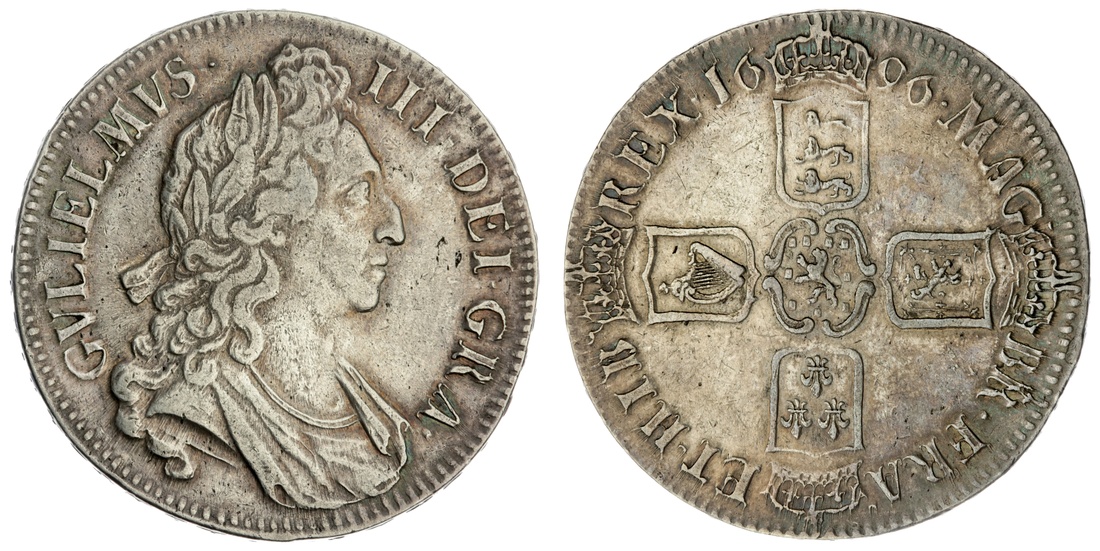 William III (1694-1702), Great Recoinage, Crown, 1696 OCTAVO, London, first laureate, draped and cuirassed bust right, rev. crowned cruciform shields, plain in angles, eight strings to first harp, nine billets, lettered edge upwards, 29.90g, 5h (ESC 89; Bull 995; Spink 3470), small metal flaw to obverse field, otherwise struck on a broad flan, with much attractive toning, especially to the reverse and legends, good very fine