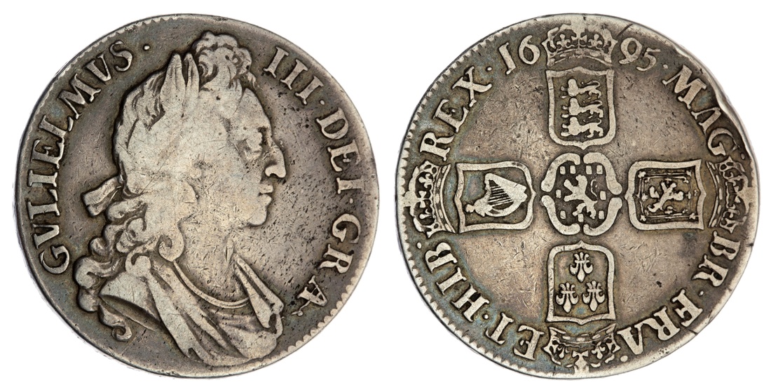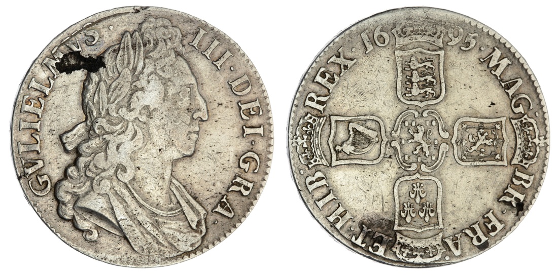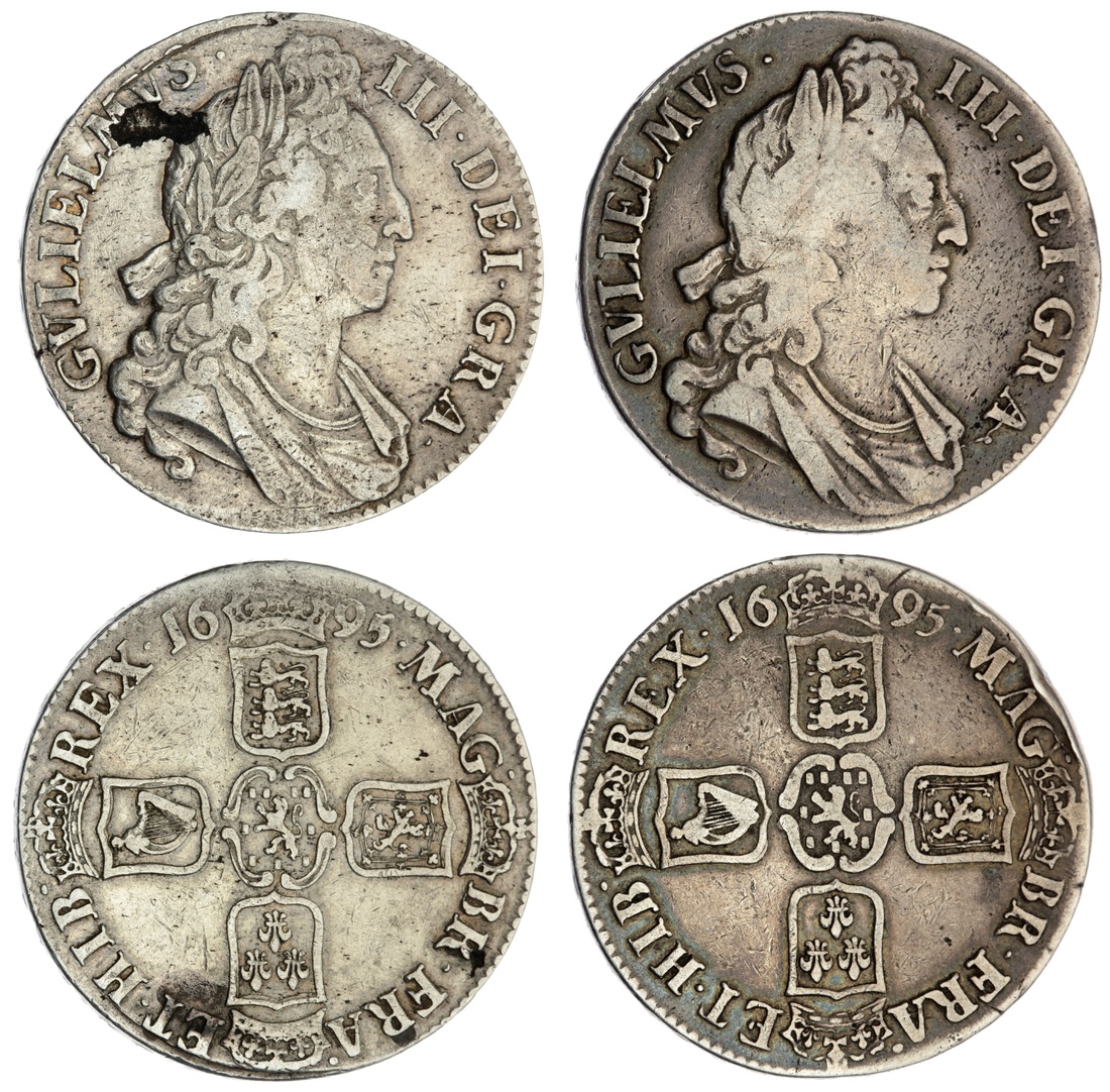 William III (1694-1702), Great Recoinage, London, Crowns, 1695 (4), SEPTIMO (2), first laureate, draped and cuirassed bust right, rev. crowned shields cruciform, eight strings to harp, nine billets, lettered edge downwards, 29.86g, 6h (Bull 990; ESC 86), obtrusive metal flaw behind head, lightly cleaned, struck details about very fine; another, similar, rev. six strings to harp, nine billets, lettered edge downwards, 28.62g, 6h (Bull 990; ESC 86), polished and rubbed on a broad flan, now retoned, about good; additionally, OCTAVO (2), similar, rev. eight strings to harp, nine billets, lettered edge upwards, 29.53g, 6h; another, rev. eight strings to harp, nine [?] billets, lettered edge downwards, 29.37g, 6h (Bull 991; ESC 87; Spink 3470), both fair to almost fine (4)