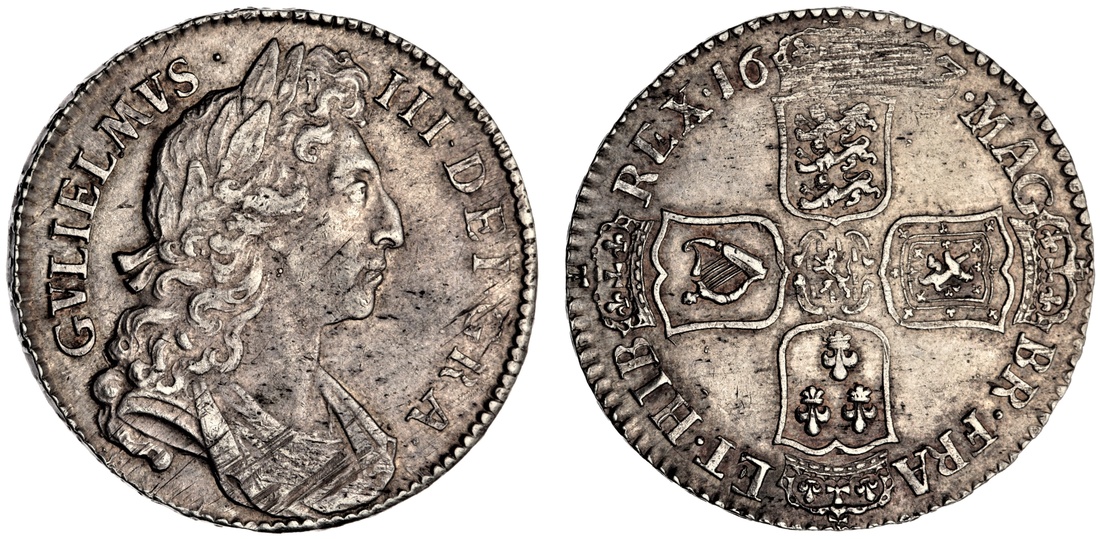 William III (1694-1702), Great Recoinage, London, Halfcrown, 1697 over 6 NONO, London, laureate, draped and cuirassed bust right, rev. large crowned shields cruciform, late harp with seven strings, nine billets, lettered edge upwards, 15.05g, 6h (Adams 447; Bull 1024 [R2]; ESC 541A; Spink 3487), adjustment marks on drapery and corresponding area on reverse, lightly wiped but with subtle purplish-gray overtone, a pleasingly bold very fine, the overdate very clear and extremely rare, far scarcer than R2 would indicate