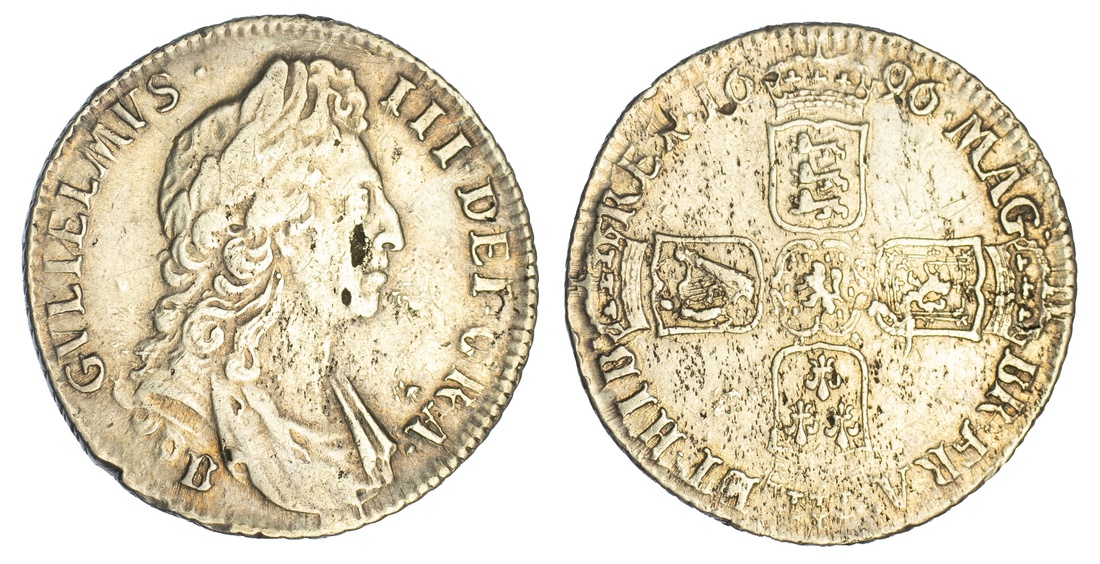 William III (1694-1702), Great Recoinage, Shilling, 1696, Bristol, first draped and laureate bust right, rev. crowned cruciform shields, plain in angles, 5 strings to harp, obliquely milled edge, 5.98g, 6h (ESC 1158; Spink 3498), haymarked and with pitted mark to face, damage to X of REX, otherwise lightly toned, very fine