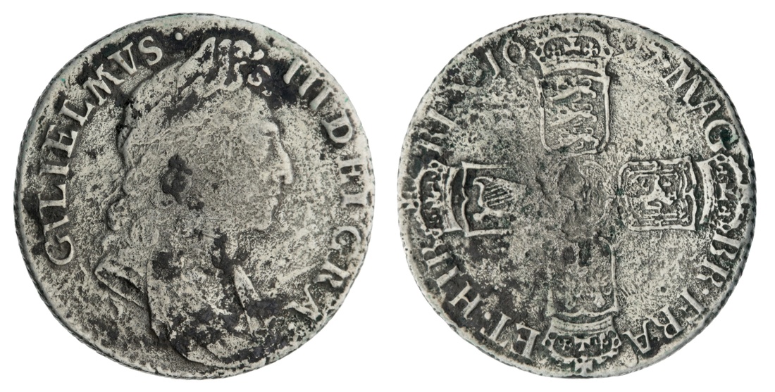 William III (1694-1702), Great Recoinage, Shilling, 1697, London, third laureate and draped bust variety right, rev. crowned cruciform shields, six strings to harp, obliquely milled edge, 5.11g, 6h (ESC 1108; Bull 1132; Spink 3511), cleaned and with heavily pitted surfaces, fair to fine