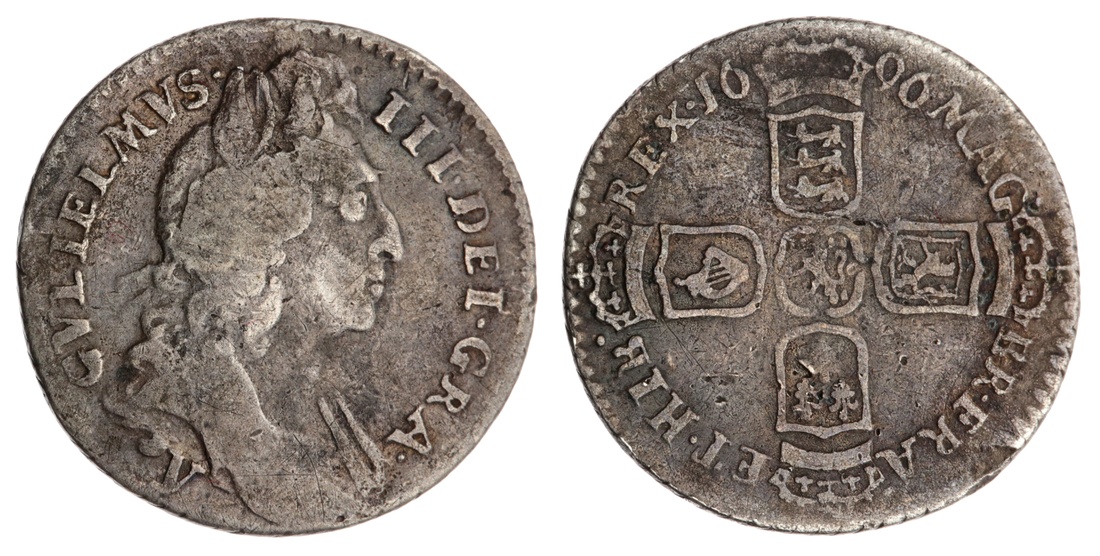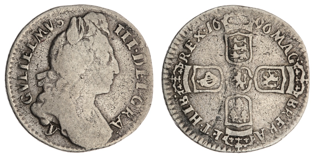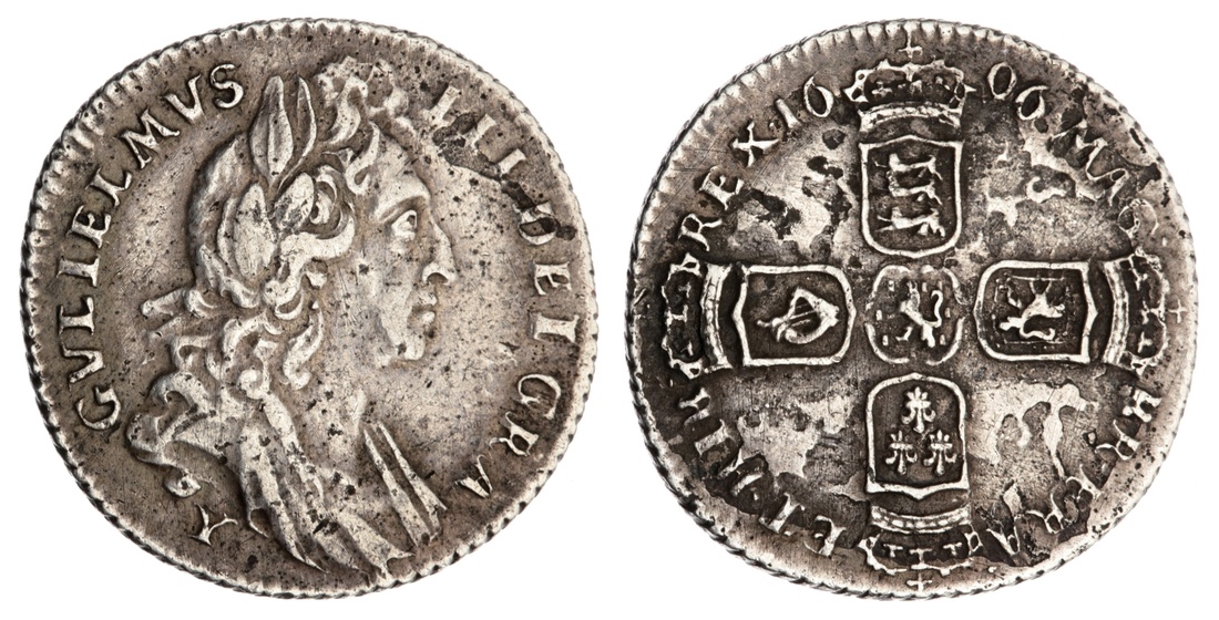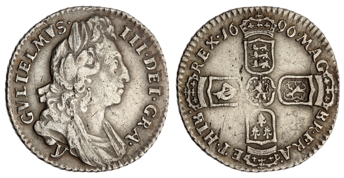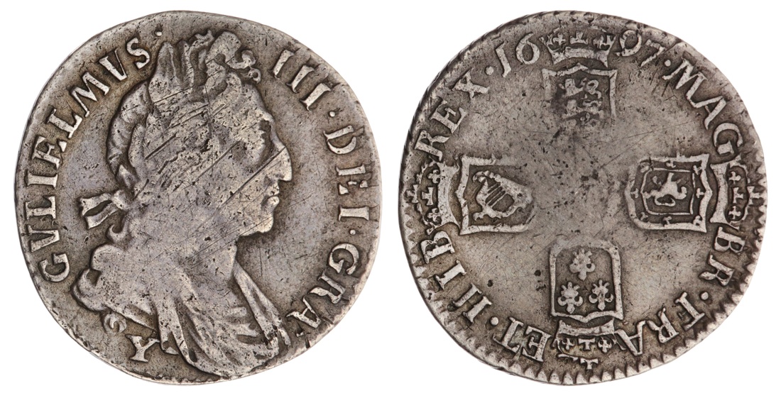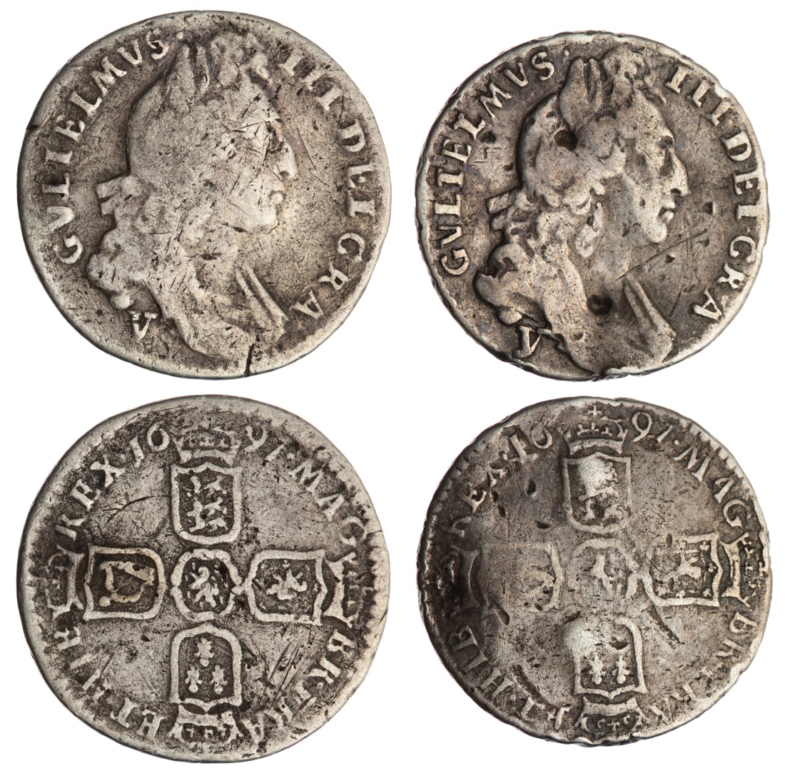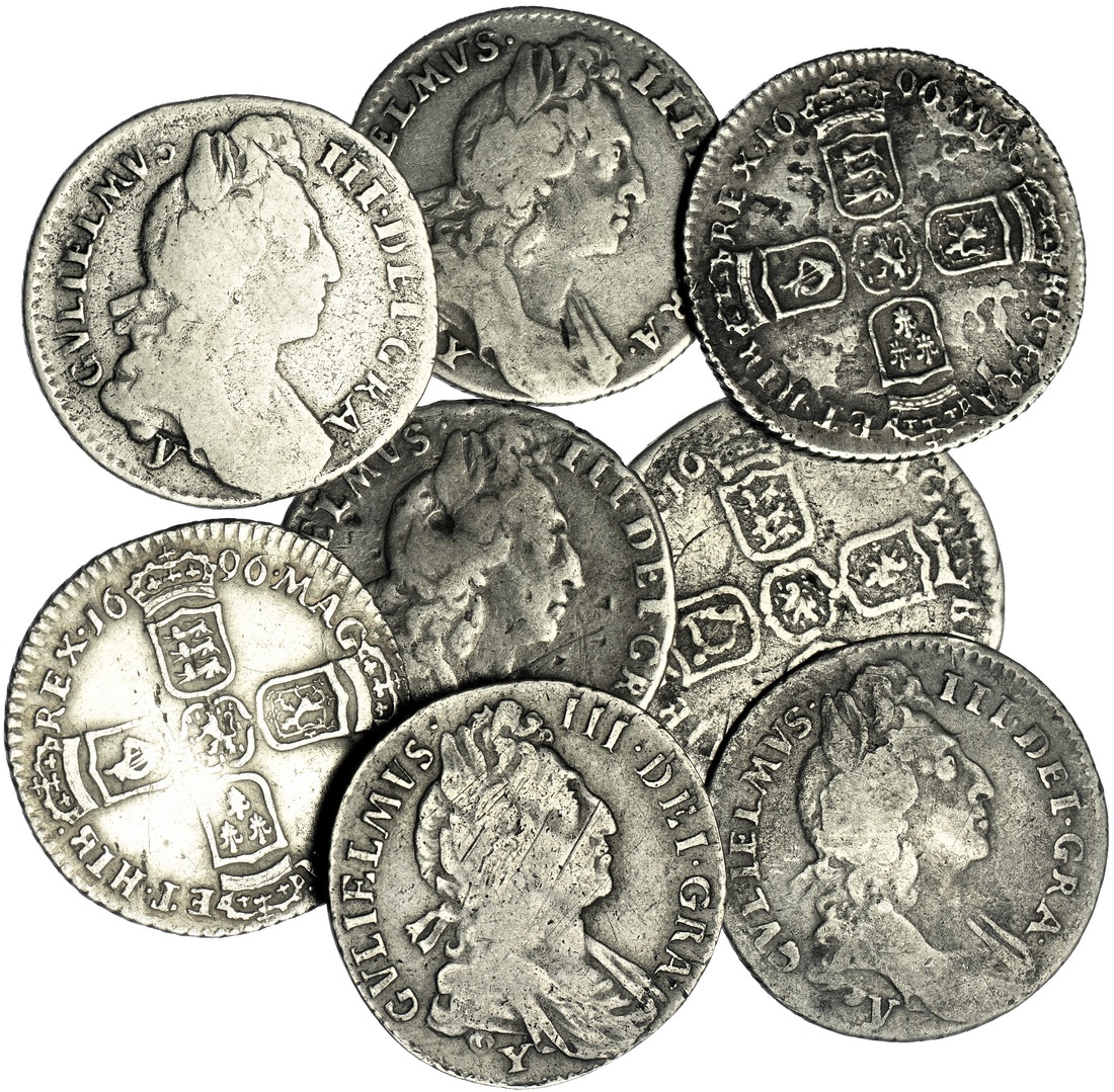 William III (1694-1702), Great Recoinage, York, Sixpences (8), 1696 (5), Capital Y (2), first laureate, draped and cuirassed bust right, Y below, rev. large crowned shields cruciform, early harp with three strings, nine billets, obliquely milled edge, 3.12g, 6h (Bull 1294; ESC 1540), almost fine; another, no stops on obverse, rev. three strings, eight billets, 3.08g, 7h (Bull 1295 [R2]; ESC 1541; Spink 3526), flaw through legend and lightly flecked, otherwise toned, granular surfaces, struck details almost very fine, very rare; also, Script y (3), as first, rev. three strings, nine billets, 3.03g, 6h, cleaned, a bolder fine; another, three strings, nine billets, 2.77g, 7h, rubbed, good / fair; and, three strings, nine billets, 2.96g, 7h (Bull 1296; ESC 1539; Spink 3525), slightly bent and darkly toned, fair; additionally, 1697 (3), first bust, script y, small crowns, late harp (2), no strings visible, seven billets, 2.96g, 6h, waterworn, fair; another, unclear, 2.96g, 6h (Bull 1298; ESC 1562; Spink 3536), dented and crimped, struck details fair, scarce; lastly, third bust, capital Y below, rev. small crowns, four strings, billets unclear, 2.46g, 6h (Bull 1301, albeit four strings not listed; ESC 1573 [R2]; Spink 3545), adjustment to centres and corresponding weakness to Lion of Nassau, otherwise rich dark cabinet tone, further historic scratches, struck details almost fine, rare; an interesting academic assemblage for York from the years of the Great Recoinage (8)