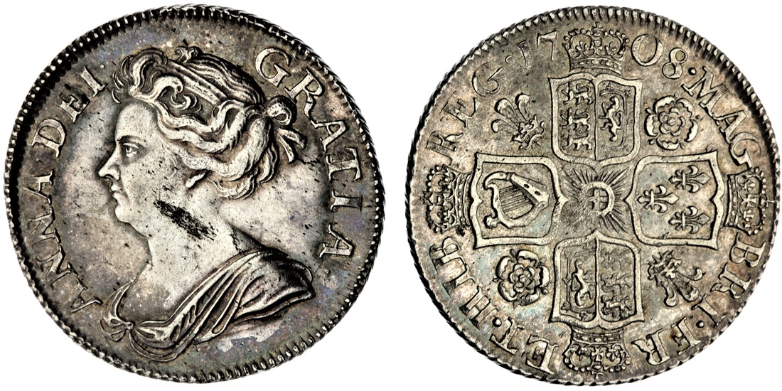 Anne (1702-1714), 'Post-Union', London, 'Roses and Plumes' Shilling, 1708, third draped bust left, rev. crowned shields cruciform, roses and plumes in angles, six strings to harp, edge obliquely milled, 6.00g, 6h (Bull 1401 [R2]; ESC 1149; Spink 3614), flecking on Queen's neck, otherwise lustrous and peripherally toned, a pleasingly good very fine, a surprising rarity in higher grades