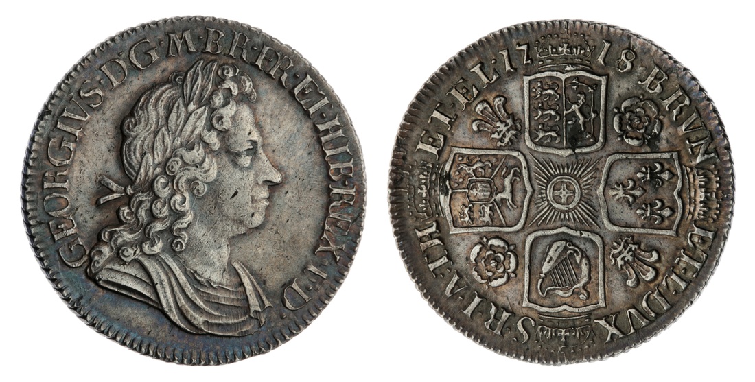 George I (1714-1727), 'Roses and Plumes' Shilling, 1718, first laureate, draped and cuirassed bust right, rev. crowned cruciform shields, roses and plumes in angles, seven strings to harp, obliquely milled edge, 6.02g, 5h (ESC 1165; Bull 1566; Spink 3645), lightly haymarked, yet residually lustrous to darkly toned surfaces, good very fine