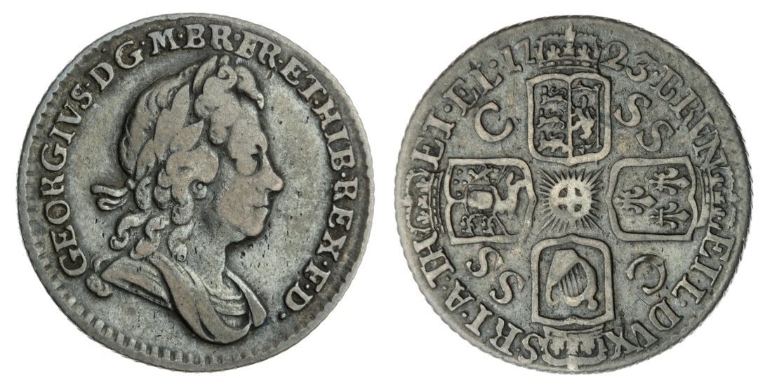 George I (1714-1727), 'South Sea Company', Sixpence, 1723, laureate and draped bust right, rev. crowned cruciform shields, SS C alternately in angles, six strings to harp, obliquely milled edge, 2.95g, 6h (ESC 1600; Bull 1612; Spink 3652), rubbed and with darkened surfaces, fine