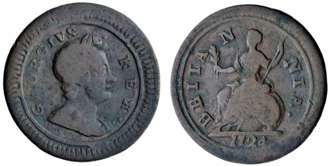 George I (1714-1727), Farthing, 1724, N/I in BRITANNIA, laureate bust right, rev. Britannia seated right, plain edge, 4.44g, 7h (Peck -; Spink 3662), mostly flat, yet a very scarce error, fine, yet rare
