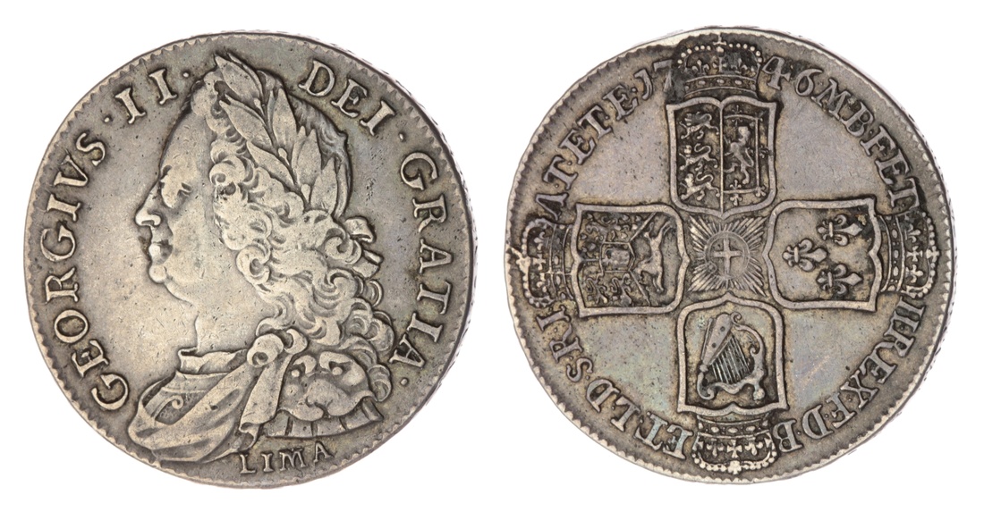 George II (1727-1760), LIMA Halfcrown, 1746 DECIMO NONO, old laureate, draped and cuirassed bust left, LIMA below, rev. crowned shields cruciform, nine strings to harp, downwards lettered edge, 14.95g, 6h (ESC 606; Bull 1688; Spink 3695A), rubbed but toned, a really bold fine