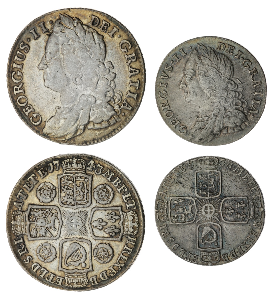 George II (1727-1760), Shilling, 1743, old laureate bust left, rev. crowned cruciform shields, roses in angles, seven strings to harp, obliquely milled edge, 5.89g, 6h (ESC 1203; Bull 1720; Spink 3702), cleaned and discoloured, bolder fine; Sixpence, 1758, old laureate bust left, rev. crowned cruciform shields, six strings to harp, obliquely milled edge, 2.93g, 6h (ESC 1623; Bull 1763; Spink 3711), lightly haymarked yet lustrous and pleasingly toned, good very fine (2)