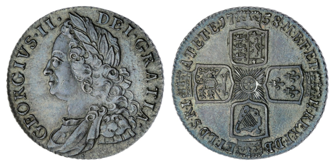 George II (1727-1760), Shilling, 1758, old laureate, draped and cuirassed bust left, rev. crowned cruciform shields, eight strings to harp, obliquely milled edge, 6.01g, 5h (ESC 1213; Bull 1734; Spink 3704), two small nailmarks to face, otherwise with a rich cabinet tone and pleasingly lustrous, extremely fine