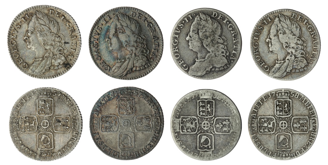 George II (1727-1760), Sixpence, 1757 (2); 1785 (2), old head left, rev. crowned cruciform shields, obliquely milled edge (ESC 1622; 1623; Bull 1762; 1763; Spink 3711), the 1757's toned, very fine, the 1758's mostly flat, fair (4)