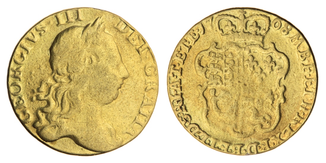 George III (1760-1820), Guinea, 1768, third laureate head right, rev. crowned shield, obliquely milled edge, 8.15g, 6h (EGC 373; Bull 678 [R2]; Spink 3727), previously mounted and with heavily sweated surfaces, fair to fine