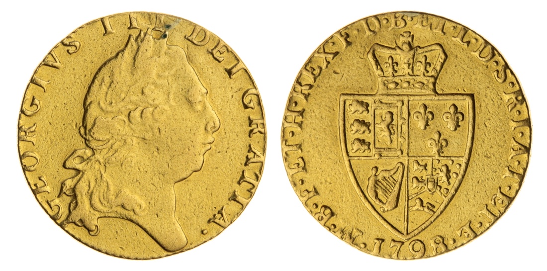 George III (1760-1820), 'Spade' Guinea, 1798, fifth head, rev. crowned 'spade' shield, edge chevron milled, 8.30g, 10h (EGC 402; Bull 735; Spink 3729), previously mounted and heavily cleaned, poor to good