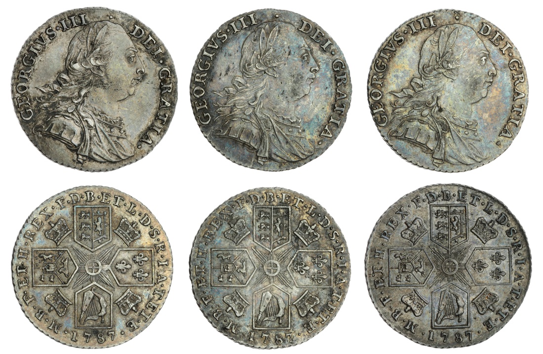 George III (1760-1820), Shilling, 1787 (3), laureate, draped and cuirassed bust right, rev. cruciform shields, crown in angles, obliquely milled edge, with hearts, 6.02g, 12h (ESC 1225; Bull 2129; Spink 3746); no hearts (2), 6.02g, 12h; 6.02g, 12h (ESC 1216; Bull 2125; Spink 3743), the first with a metal flaw to neck, otherwise lustrous and toned, near extremely fine, the others with some haymarking and a hint of rub to higher points, otherwise toned and with a residual lustre, bolder very fine (3)