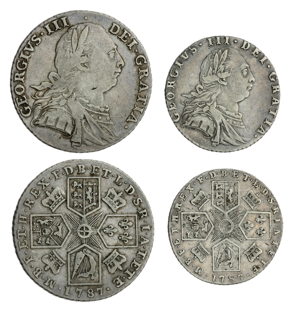 George III (1760-1820), Shilling, 1787, laureate and armoured bust right, rev. cruciform shields, with hearts, seven strings to harp, obliquely milled edge, 5.92g, 12h (ESC 1225; Bull 2129; Spink 3746), some flatness to the hairyet with hints of toning to dark grey surfaces, very fine; Sixpence, 1787, laureate and draped bust right, rev. cruciform shields, with hearts, six strings to harp, obliquely milled edge, 2.98g, 12h (ESC 1629; Bull 2190; Spink 3749), some flashiness and toning to dark grey surfaces, very fine (2)
