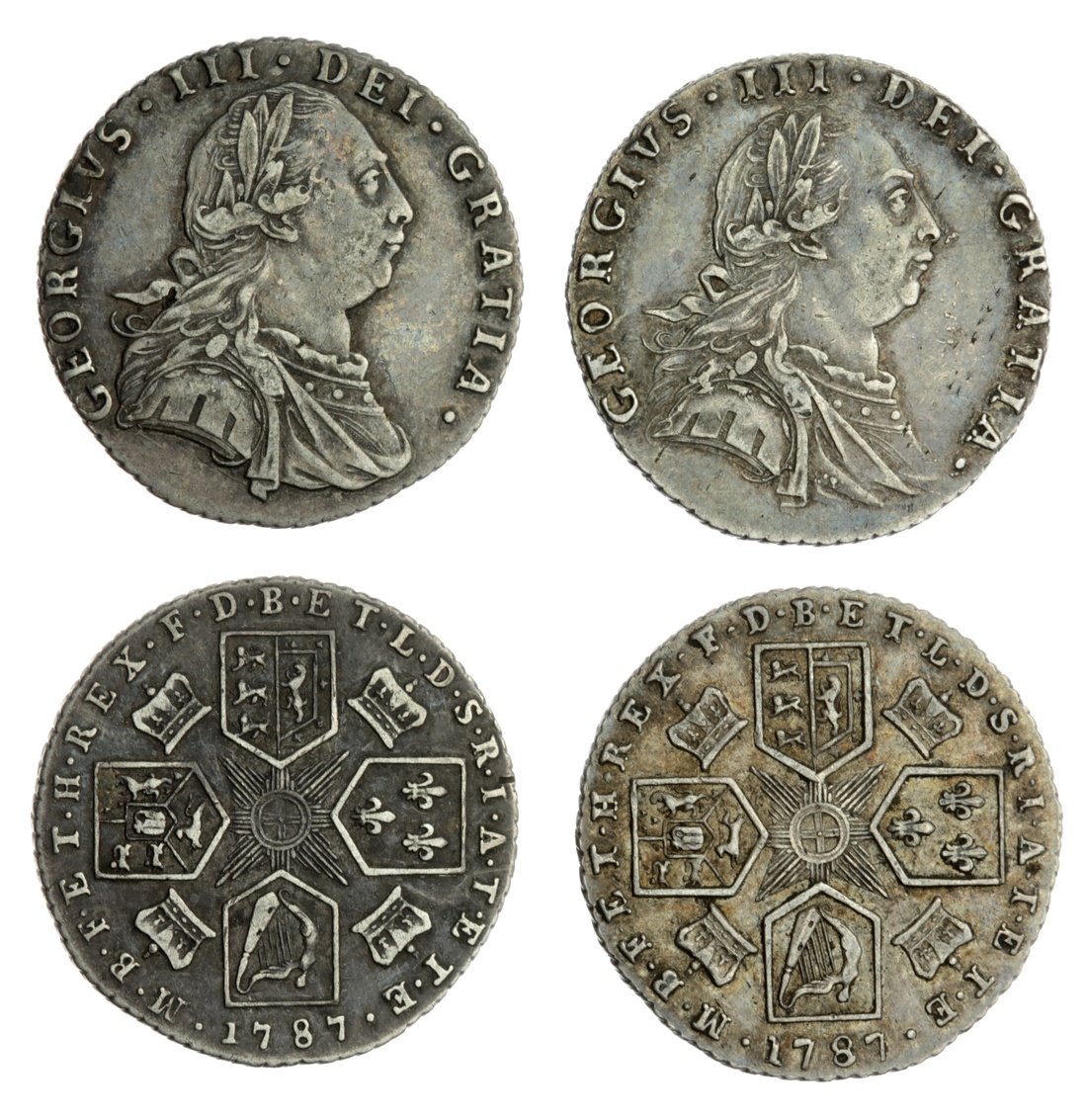 George III (1760-1820), Sixpence, 1787 (2), laureate, draped and cuirassed bust right, with hearts, rev. cruciform shields, crown in angles, obliquely milled edge, 2.98g, 12h; 3.01g, 12h (ESC 1629; Bull 2190; Spink 3749), both with some contact marks, yet cabinet toned, very fine (2)