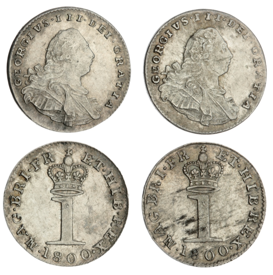 George III (1760-1820), Maundy Pennies, 1800 (2), draped and cuirassed bust right, rev. crowned denomination, plain edge, 0.50g, 12h; 0.51g, 12h (ESC 2421; Bull -; Spink 3760), the second haymarked to the reverse, yet both pleasingly toned and lustrous, extremely fine (2)