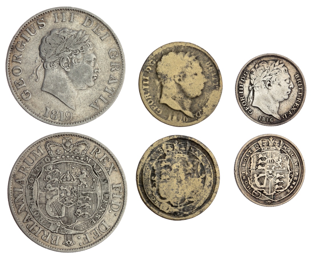 George III (1760-1820), 'New Coinage' Halfcrown, 1819, laureate head right, rev. crowned shield within Garter, milled edge, 13.83g, 12h (ESC 623; Bull 2102; Spink 3789), some flatness to higher points and hints of verdigris, otherwise about very fine; 'New Coinage' Sixpence, 1816, laureate head right, rev. crowned shield within Garter, milled edge, 2.67g, 12h (ESC 1630; Bull 2191; Spink 3791), cleaned and with lightly pitted surfaces to the obverse, about very fine; 'Total Counterfeit' Shilling, 1820, struck in brass, laureate head right, rev. crowned shield within Garter, milled edge, 3.30g, 12h, rubbed and mostly flat, fair to fine (3)