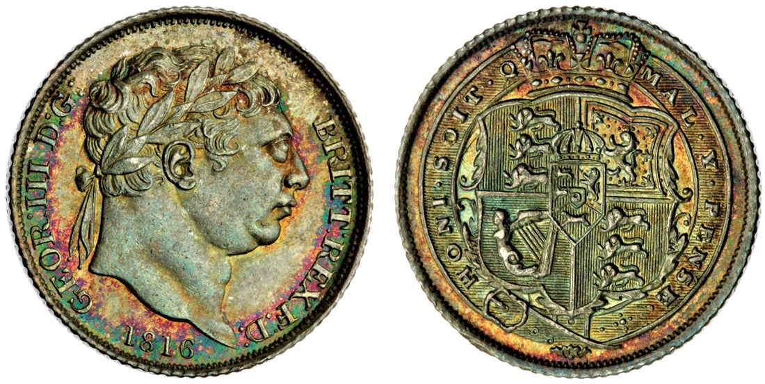 George III (1760-1820), 'New Coinage', Sixpence, 1816, laureate head right, rev. crowned shield within Garter, milled edge, 2.91g, 12h (ESC 1630; Bull 2191; Spink 3791), extraordinarily iridescently toned with original lustre beneath, a pleasing extremely fine