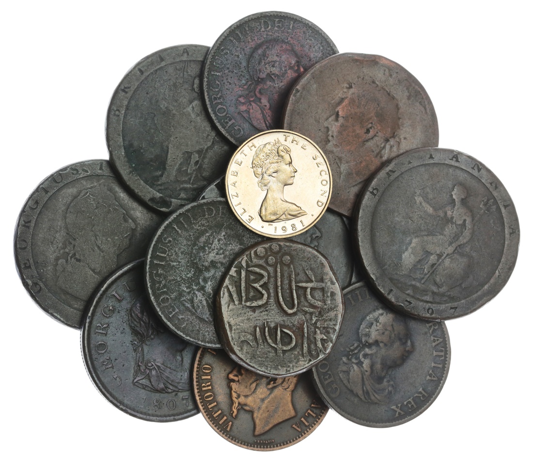 Collection of Copper and Base Metal (12) | George III (1760-1820), Twopence, Soho, 1797 (Spink 3776); Penny, Soho, 1797 (3) (Spink 3777); 1807 (Spink 3780); Halfpenny, Soho, 1799 (3) (Spink 3778); George IV (1820-1830), Penny, illegible date (Spink 3823); Isle of Man, Elizabeth II (1952-2022), Pound, 1981; Italy, Victor Emmanuel II (1861-1878), 10 Centesimi, 1866 M (KM 11.1); Maratha Empire, Chhatrapati Savaji (1674-1680), Copper Paisa, in a mix of conditions, from fair to very fine (11)