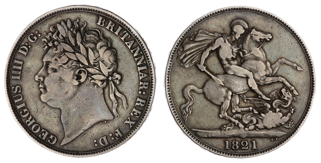 George IV (1820-1830), Crown, 1821 SECUNDO, laureate head left, rev. St George and Dragon, lettered edge downwards, 27.96g, 7h (ESC 246; Bull 2310; Spink 3805), lightly contact marked and higer areas flat in places, otherwise darkly toned, near very fine