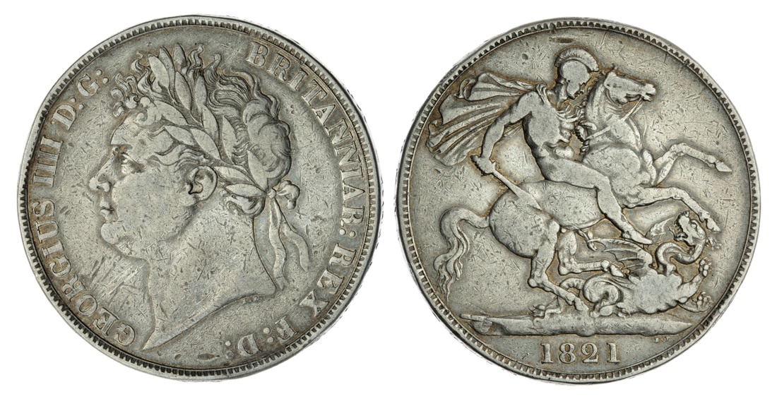 George IV (1820-1830), Crown, 1821 SECUNDO, laureate bust left, rev. St George and Dragon, downwards lettered edge, 27.86g, 7h (ESC 246; Bull 2310; Spink 3805), heavily bagmarked and a bruise to edge at 11 o'clock, cleaned yet now retoning, fine