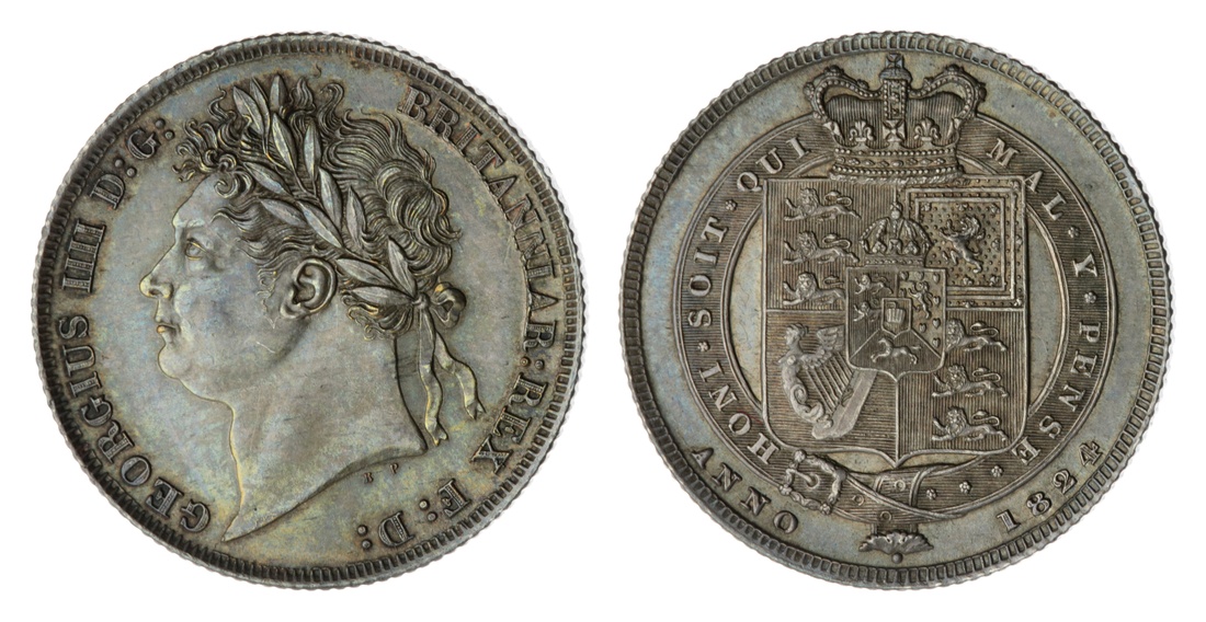 George IV (1820-1830), 'Garter' Shilling, 1824, Type 2, laureate head left, rev. crowned shield within Garter, milled edge, 5.71g, 6h (ESC 1251; Bull 2400; Spink 3811), a minute contact point on cheek, struck with freshly hardened dies with sharp hairline definition, otherwise lustrous and lightly toned, extremely fine