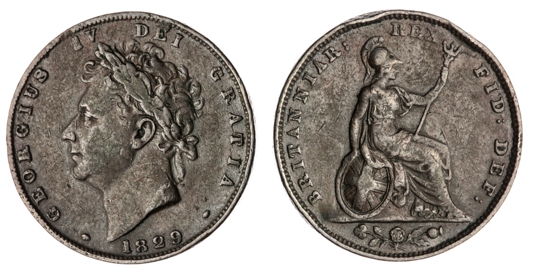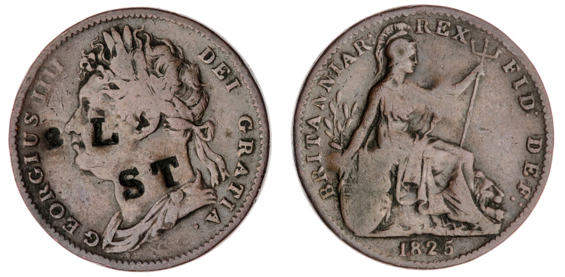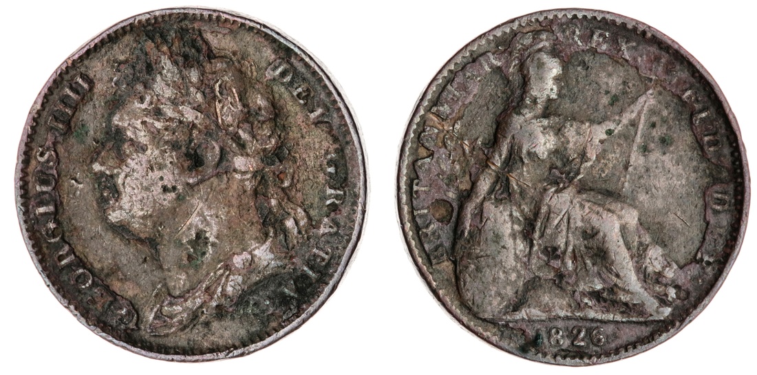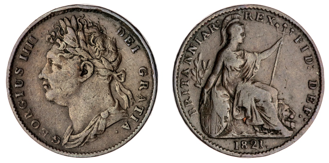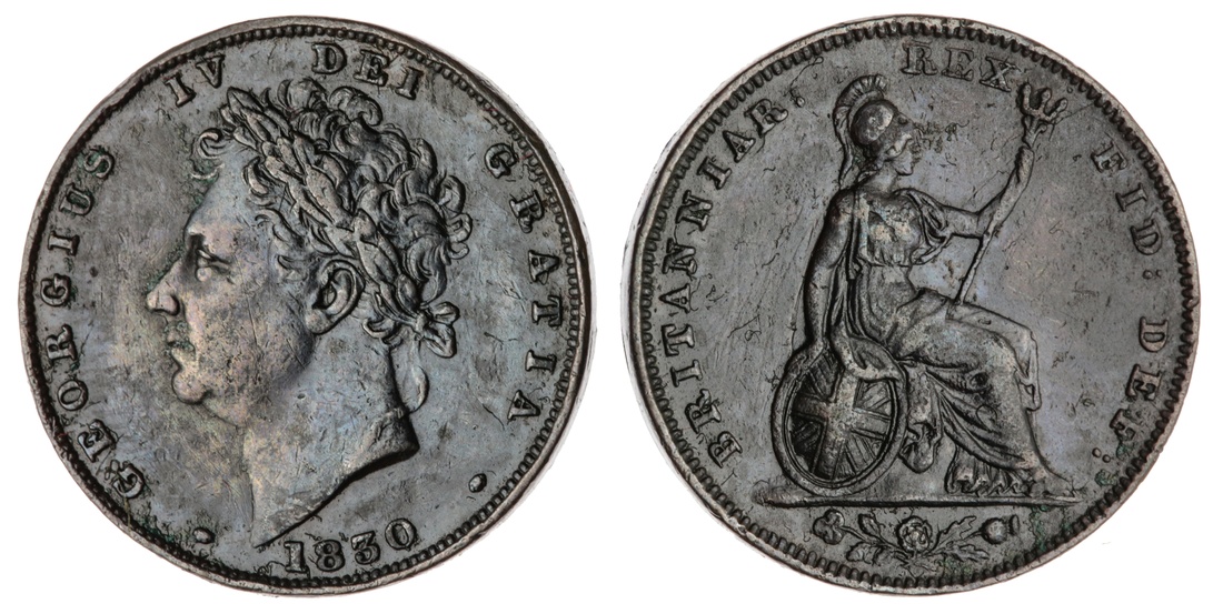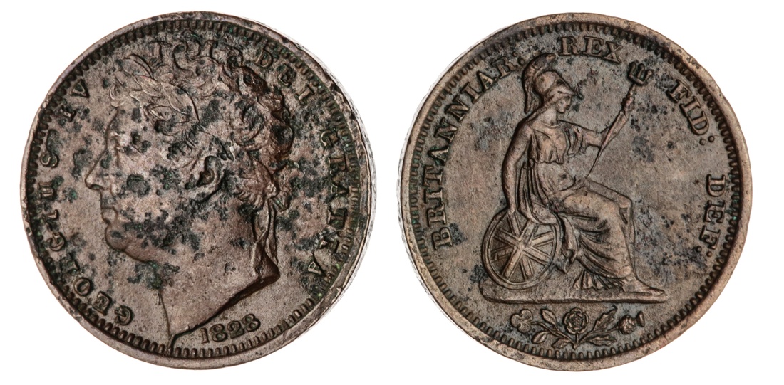 George IV (1820-1830), Farthings (18), 1821; 1822 (3); 1823 (2); 1825 (3); 1826 (3); 1827 (2); 1828 (2); 1829; 1830 (Spink 3822; 3825); also, Half-Farthing, 1828 (Spink 3826), one 1823 has been previously gilded and subsequently cut, one 1825 has been inscribed with initials to obverse, in conditions from very fine to fair, some with verdigris; additionally, Penny, 1826 (Spink 3823), verdigris, rubbed smooth, poor (20)