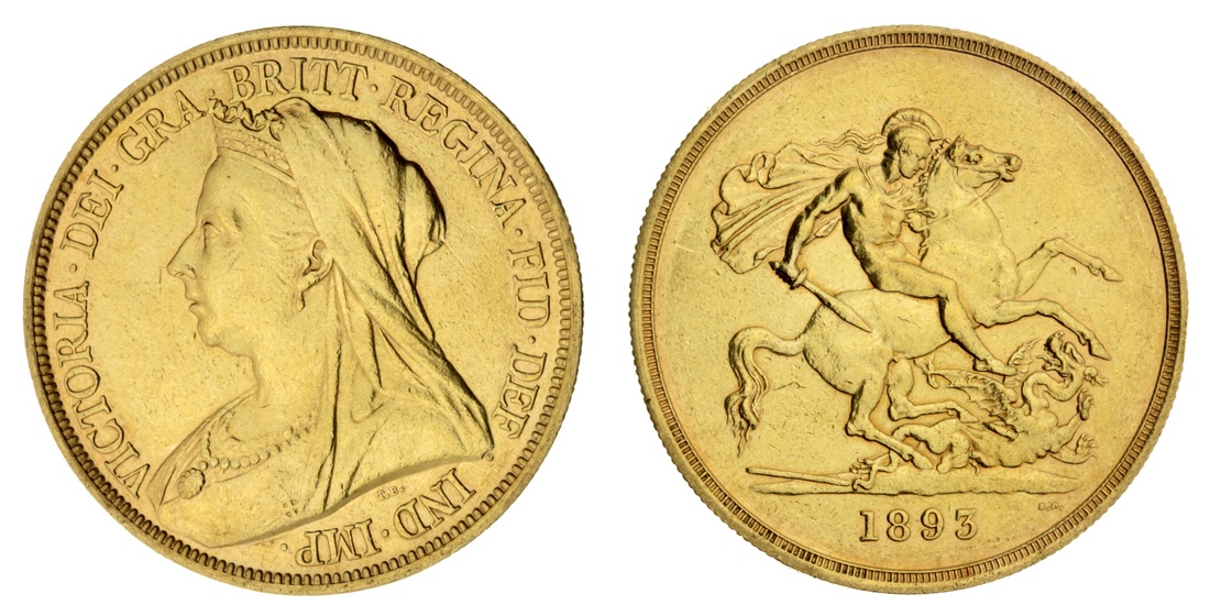 (g) Victoria (1837-1901), 'Old Head' Five-Pounds, 1893, veiled head left, rev. St. George and Dragon, edge milled, 39.97g, 12h (Stratos 205; MCE -; Hill F33; Spink 3872), lightly cleaned with traces of sweating in residually lustrous fields, struck details better than very fine, scarce