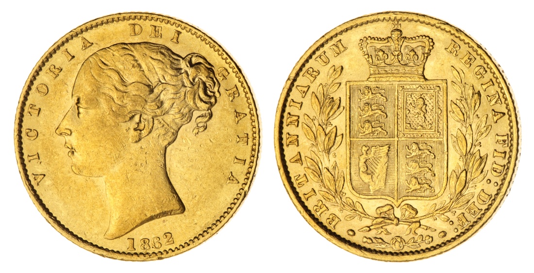 (g) Victoria (1837-1901), 'Shieldback' Sovereign, 1862, Type 1a, young head left, rev. crowned shield, milled edge, 7.99g, 6h (Marsh 45; Spink 3852D), the obverse previously wiped and lightly contact marked, otherwise with an attractive lustre to the legend and reverse, very fine / good very fine