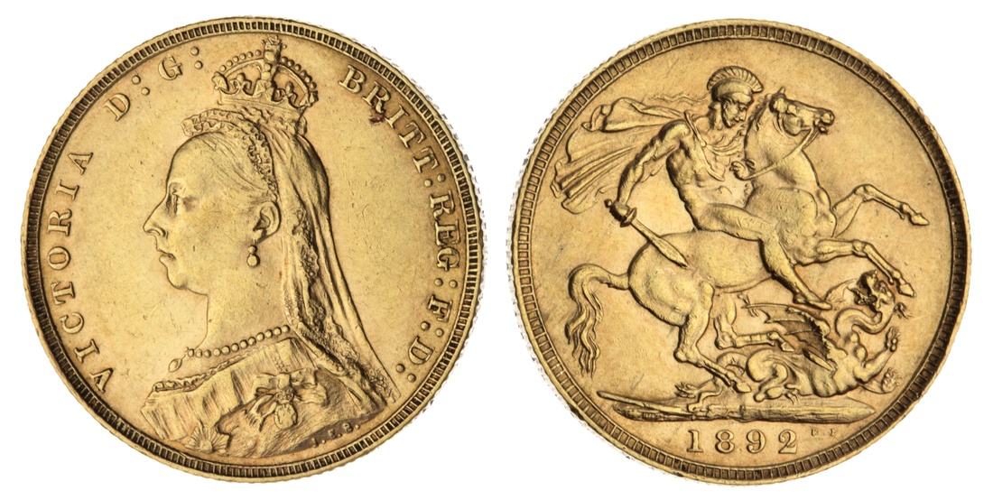 (g) Victoria (1837-1901), 'Jubilee' Sovereign, 1892, Jubilee bust left, rev. St George and Dragon, milled edge, 7.98g, 12h (Marsh 130; Spink 3866C), a scattering of pin marks and wiped, yet with lustre to legend, very fine
