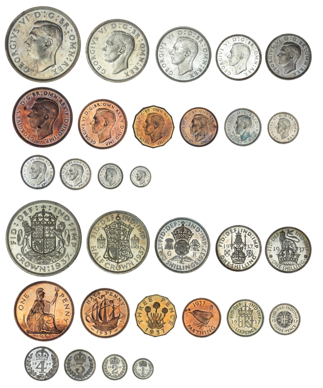 George VI (1936-1952), Coronation Specimen Set, 1937 (15), Crown to Farthing, and Maundy Fourpence to Penny (Spink PS16), the Penny with a couple of spots of verdigris, otherwise all lightly toned and brilliant, about as struck, in original Royal Mint case of issue (15)