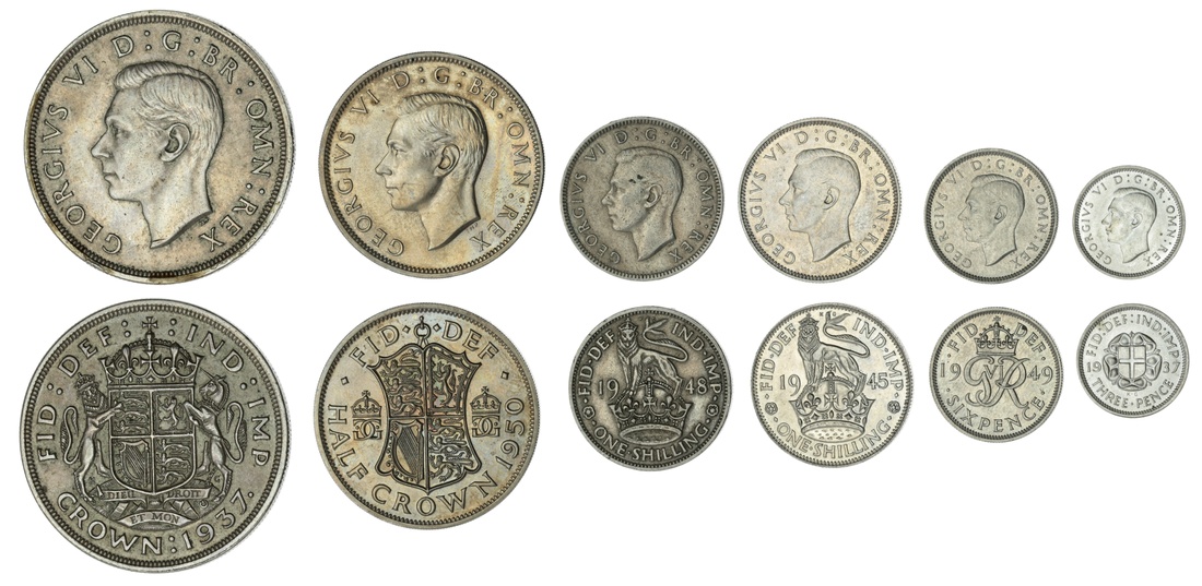 Mixed Silver and Cupro-Nickel (6) | George VI (1936-1952), 'Coronation' Crown, 1937, milled edge, 12h, 28.31g (ESC 392; Bull 4020; Spink 4078); Proof Halfcrown, 1950, milled edge, 12h, 14.18g (ESC -; Bull 4069; Spink 4106); Shilling, 1945; milled edge, 12h, 5.73g; 1948, milled edge, 12h, 5.68g (ESC 1468; 1474; Bull 4143; 4183; Spink 4082; 4103); Sixpence, 1949, milled edge, 12h, 2.80g (ESC 1838A; Bull 4255; Spink 4110); Threepence, 1937, milled edge, 12h, 1.41g (ESC 2150; Bull 4275; Spink 4085), the Crown very fine, the 1948 Shilling fine, the rest extremely fine (6)