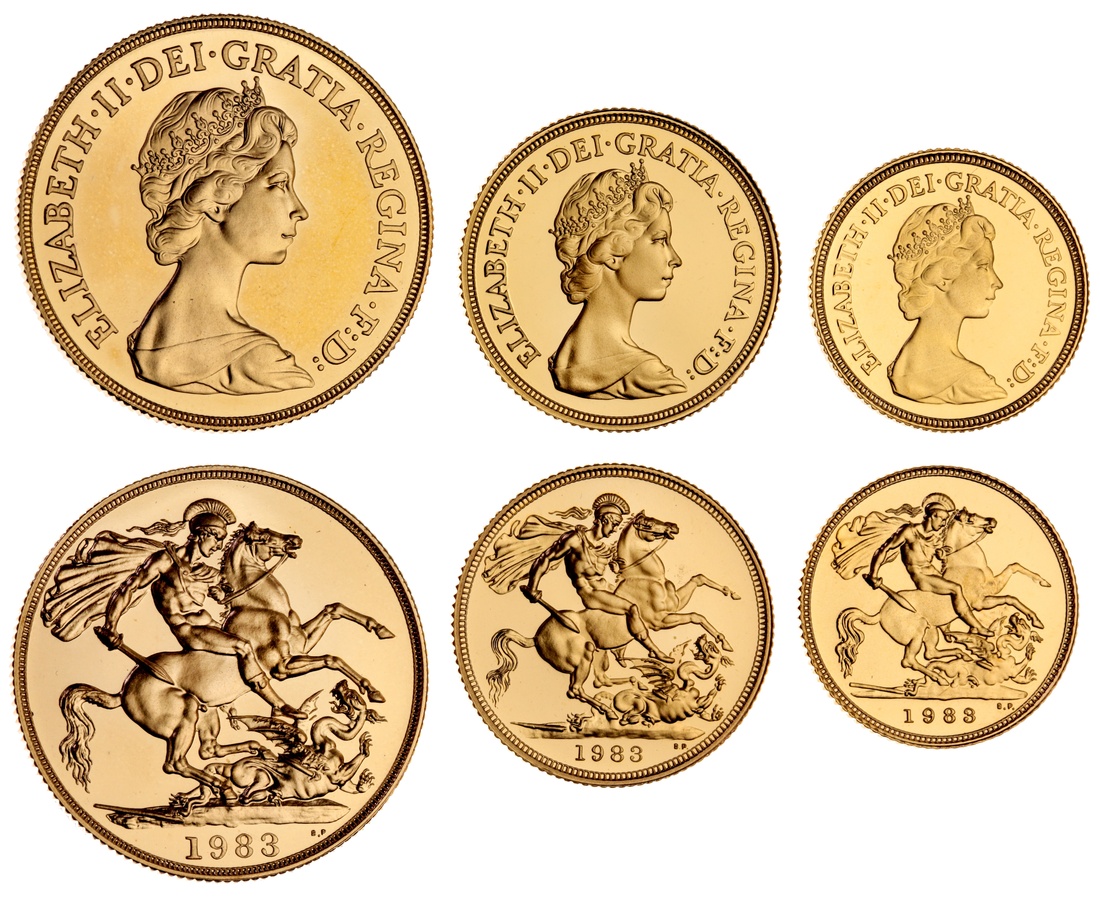 (g) Elizabeth II (1952-2022), Proof Three Coin Set, 1983, Two Pounds, Sovereign and Half Sovereign, crowned head right, rev. St George and dragon, milled edge, 15.96g; 8.00g; 4.00g (Spink PGS04), some handling marks to obverse fields, otherwise brilliant and as struck (3)