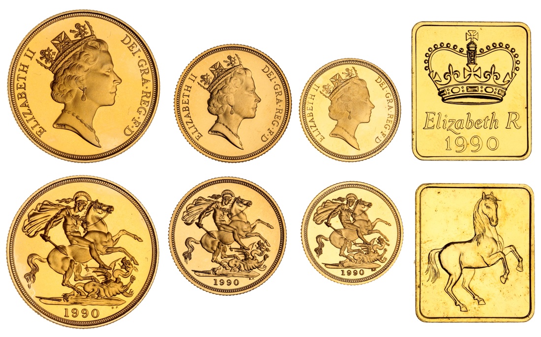 (g) Elizabeth II (1952-2022), Proof Three Coin Set, 1990, Two Pounds, Sovereign and Half Sovereign, crowned head right, rev. St George and dragon, milled edge, 16.04g; 8.00g; 3.99g (Spink PGS13), Two Pounds obverse field with friction marks, otherwise all brilliant and as struck, in original Royal Mint case of issue, No. 0753 (3)