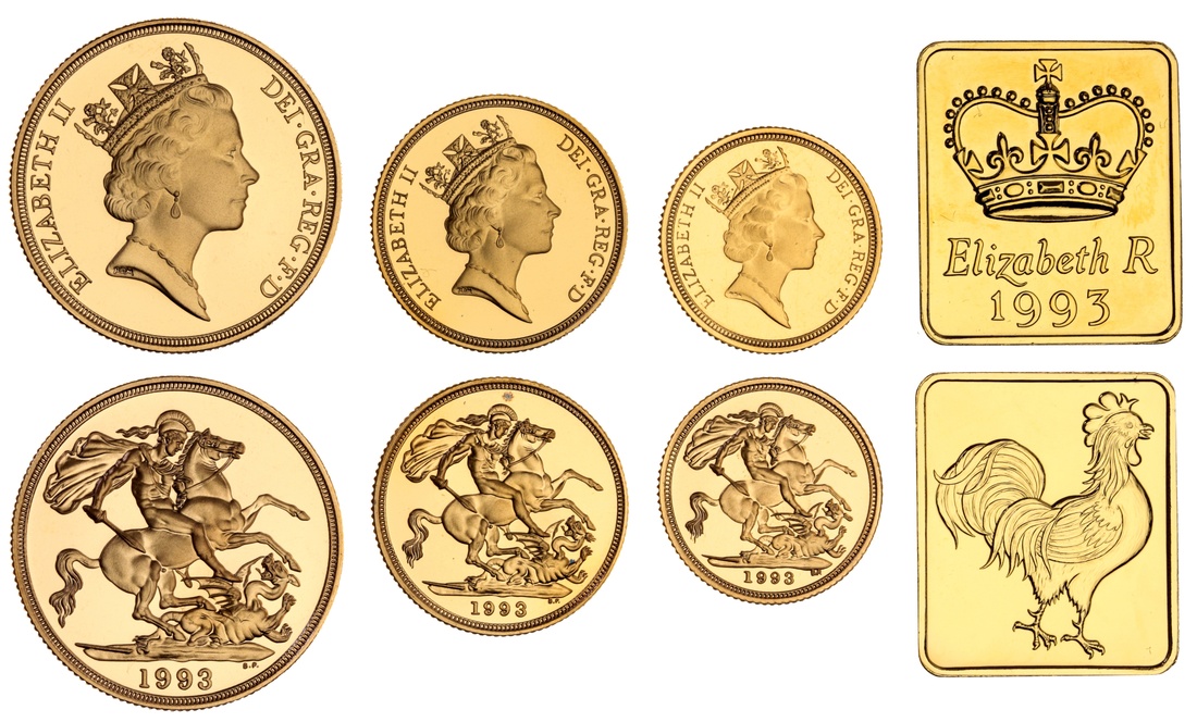 (g) Elizabeth II (1952-2022), Proof Three Coin Set, 1993, Two Pounds, Sovereign and Half Sovereign, crowned head right, rev. St George and dragon, milled edge, 15.96g; 7.99g; 3.99g (Spink PGS29), mark below chin of Two Pounds, toning spot to Sovereign, otherwise all brilliant and as struck, in original Royal Mint case of issue, No. 0547 (3)