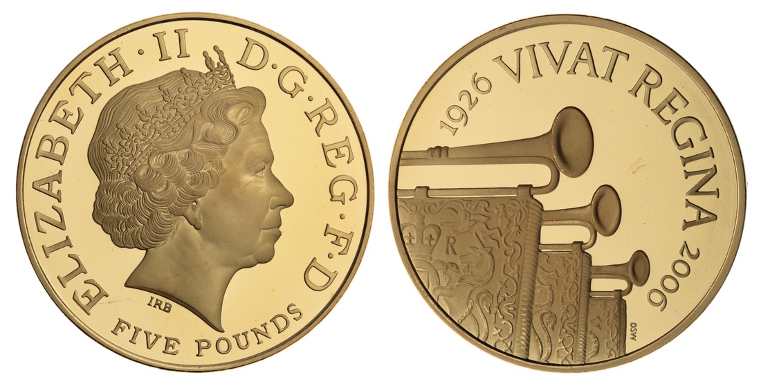 (g) Elizabeth II (1952-2022), 'Queen's 80th Birthday' Proof Five-Pounds, 2006, crowned bust right, by Ian Rank-Broadley, rev. a fanfare of regal trumpets, lettered edge, 12h (Spink L16), brilliant, as struck, No. 1426 of only 2,750 struck