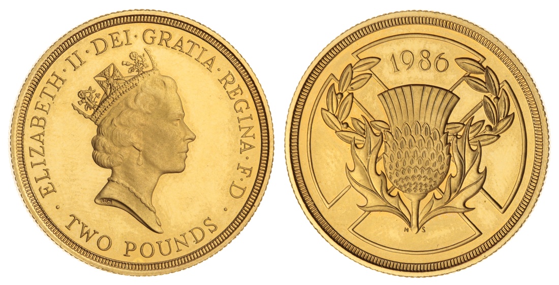 (g) Elizabeth II (1952-2022), 'Commonwealth Games' Proof Two-Pounds, 1986, crowned bust right, rev. St. Andrew's cross with laurel leaves and thistle, 15.96g, 12h, milled edge, (Spink K1), fields have misted, otherwise extremely fine
