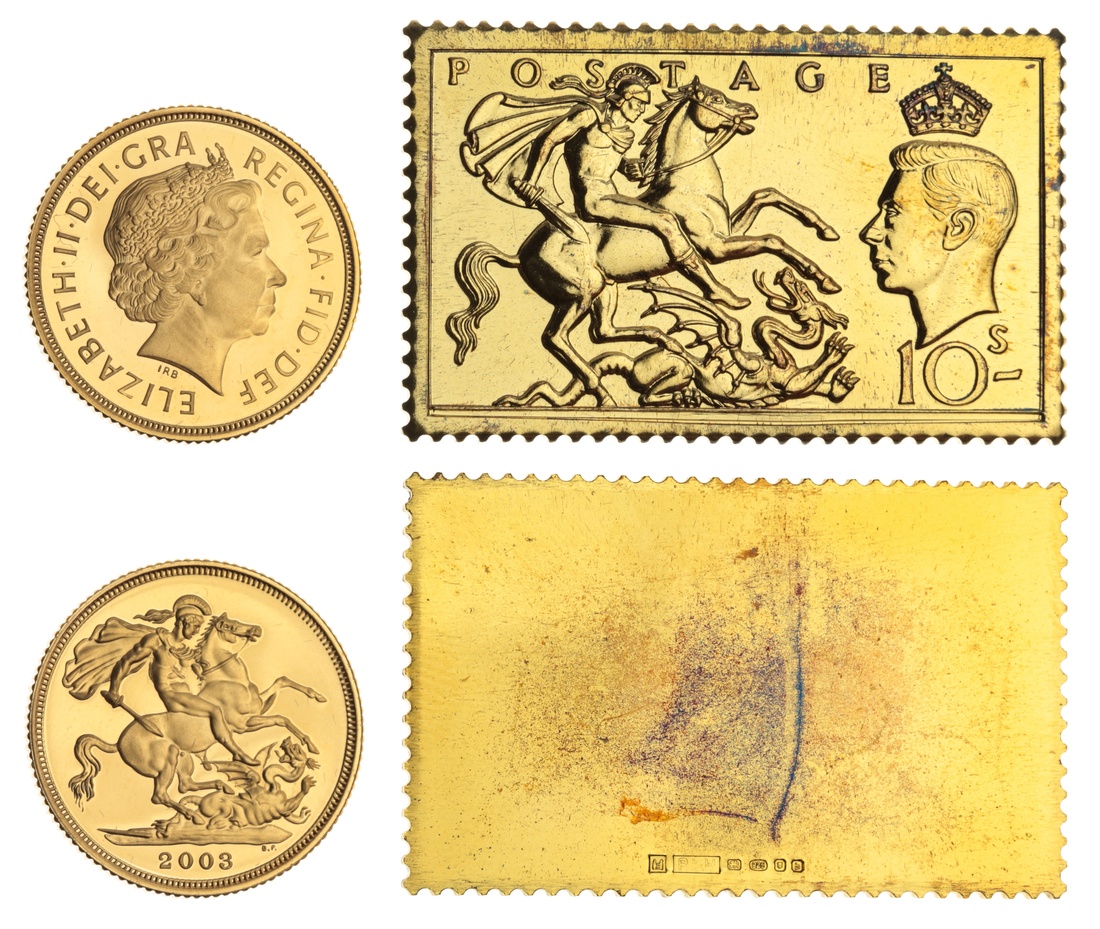 (g) Elizabeth II (1952-2022), Proof Sovereign and Gilt-Silver Stamp Ingot Set, 2003, Proof Sovereign, 2003, crowned bust right, rev. St George and dragon, milled edge, 12h, 7.97g (Spink SC4), brilliant, as struck; Gilt-Silver Uniface Stamp Ingot, struck in .925 silver, gilded in 24 carat gold, St George and dragon, George VI bust left, 19.8g, proof-like, as struck