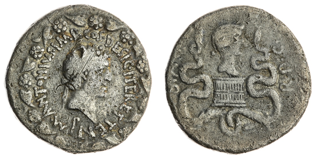 Roman Republic Marc Antony and Octavia, AR Cistophoric Tetradrachm, 39BC, Bust of Marc Antony right, wearing ivy wreath, lituus below, all within wreath of ivy and flowers, rev. head of Octavia atop Cista Mystica, between 2 snakes, 11.41g, (RPC I 2201; RSC 2; CRI 262; BMCRR East 133.) Dull toning, surface dings and scratches, fairly worn, fine
